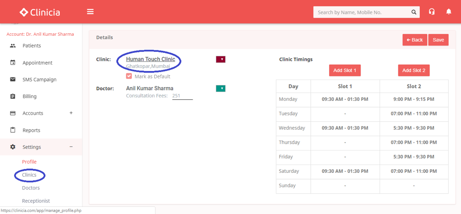 Clinicia allows Practitioner to manage their all the clinics from Single account only. Doctors can add the details of all the clinics. Clinic details broadly covers Clinic address, Clinic contact details, Timing, Services offered in Clinic along with many Clinic level preferences.