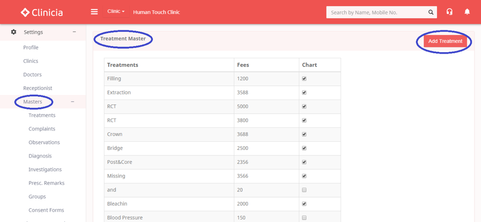 Master set up allows user to store frequently used values / terminologies under the respective Masters. All this values entered under the master will be available for auto-selection to Users while recording Patient’s Visits and other forms in Application. This makes it very easy & time saving for User to fill up the information in Forms.